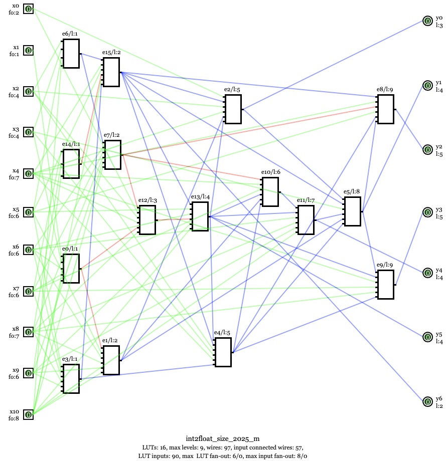 Below is an example comparing the best published Int to float converter design (int2float_size_2024) from the IPFL benchmark 2024 with GTs’ improved versions.Original (int2float_size_2024):