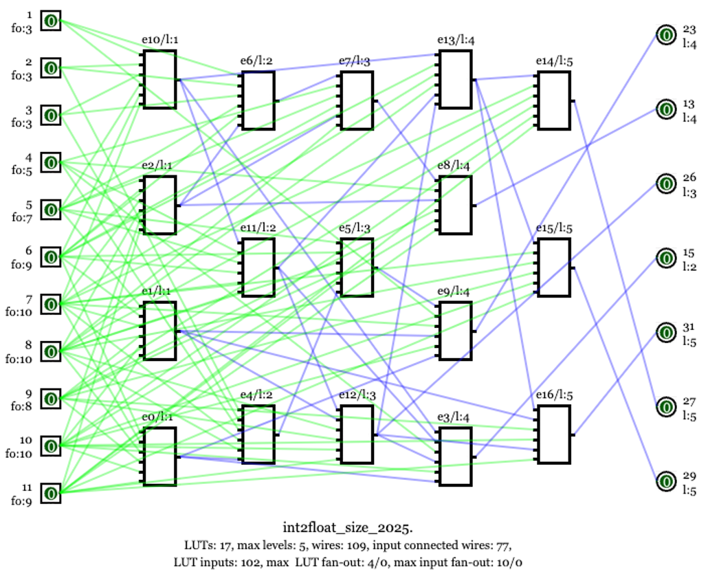 Below is an example comparing the best published Int to float converter design (int2float_size_2024) from the IPFL benchmark 2024 with GTs’ improved versions.Original (int2float_size_2024):